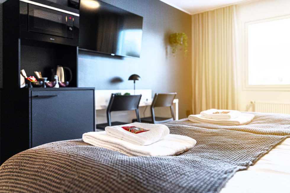 Huoneen varusteluun kuuluu huoneluokan mukainen määrä laadukkaita vuoteita, pyyhkeet, jääkaappi, vedenkeitin, mikro, taulutelevisio, suihku sekä hiustenkuivain.